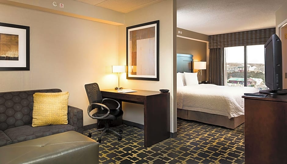 This mobility accessible room features a sofa bed, microwave, refrigerator, and flat-screen TV.